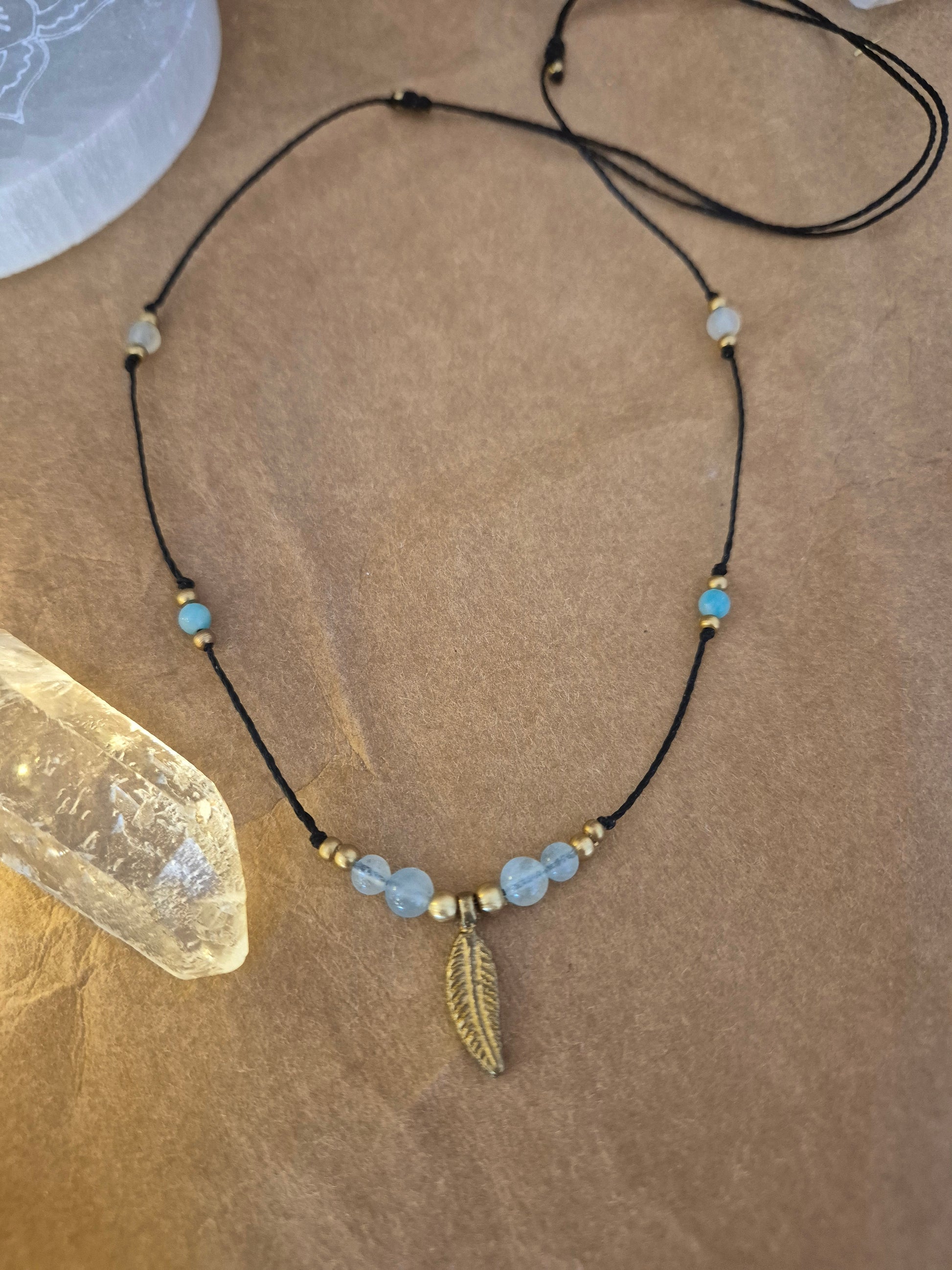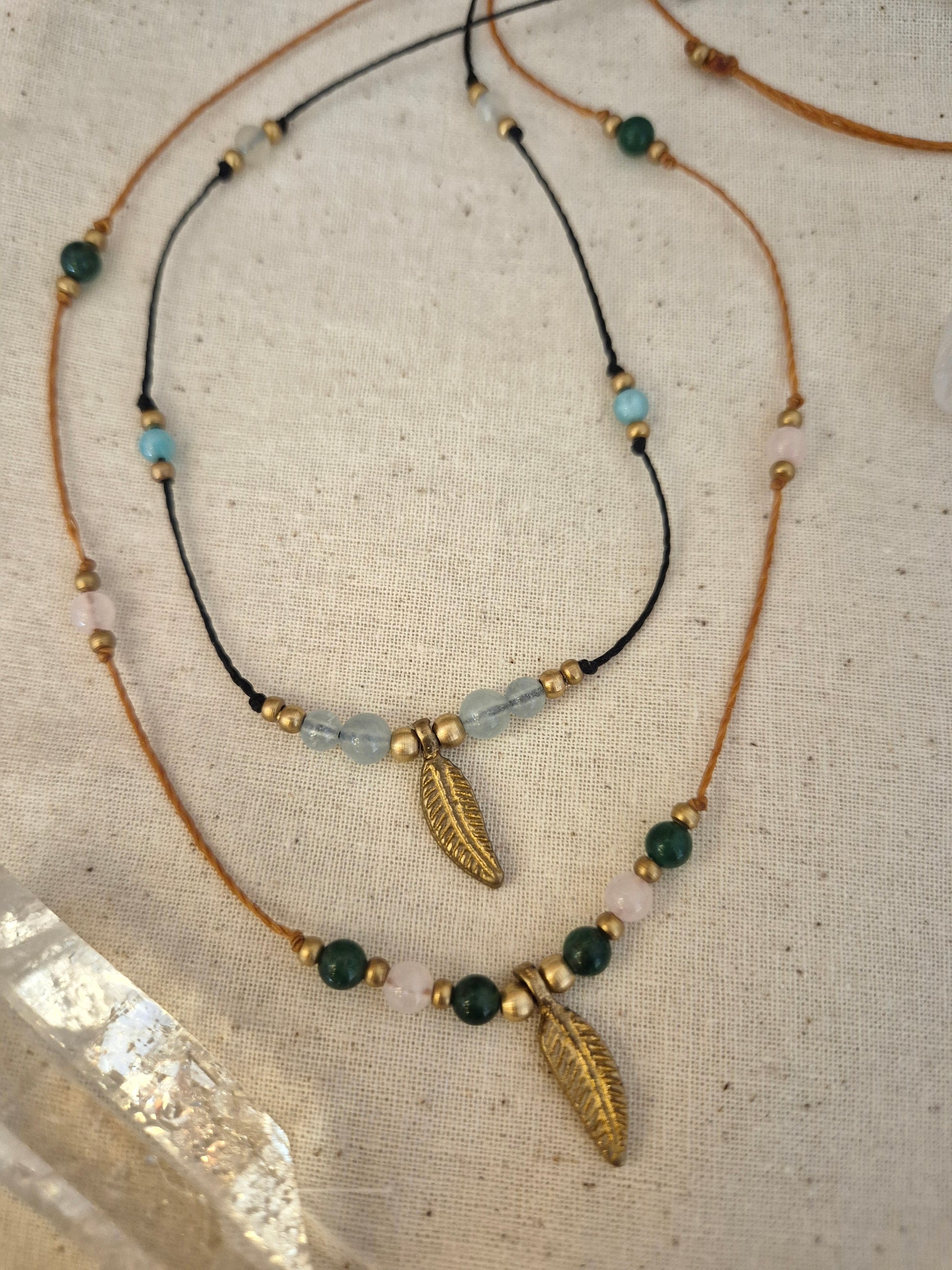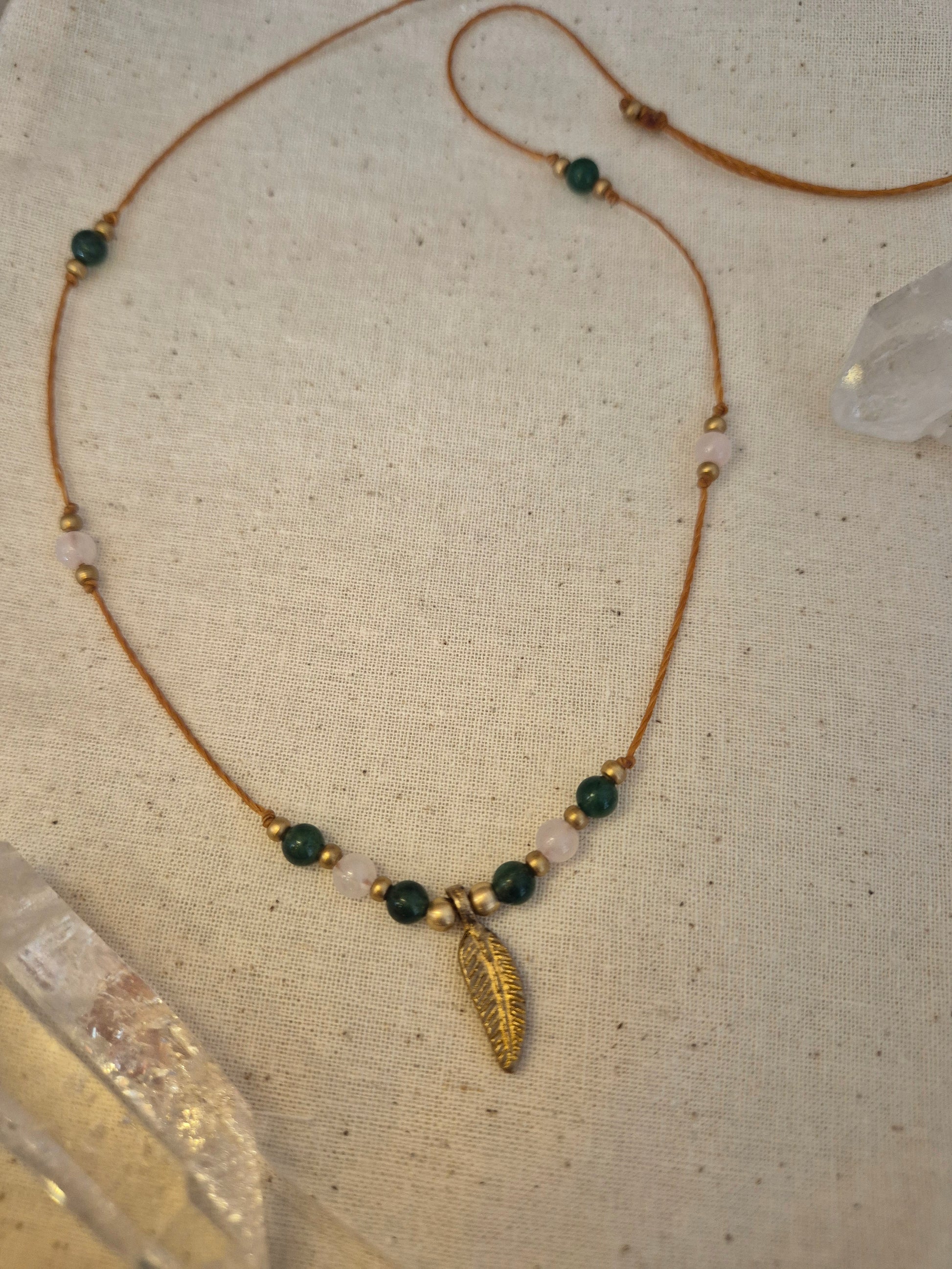 Die Kette Aquila vereint die Leichtigkeit einer Feder mit der sanften Kraft von Aventurin und Rosenquarz.