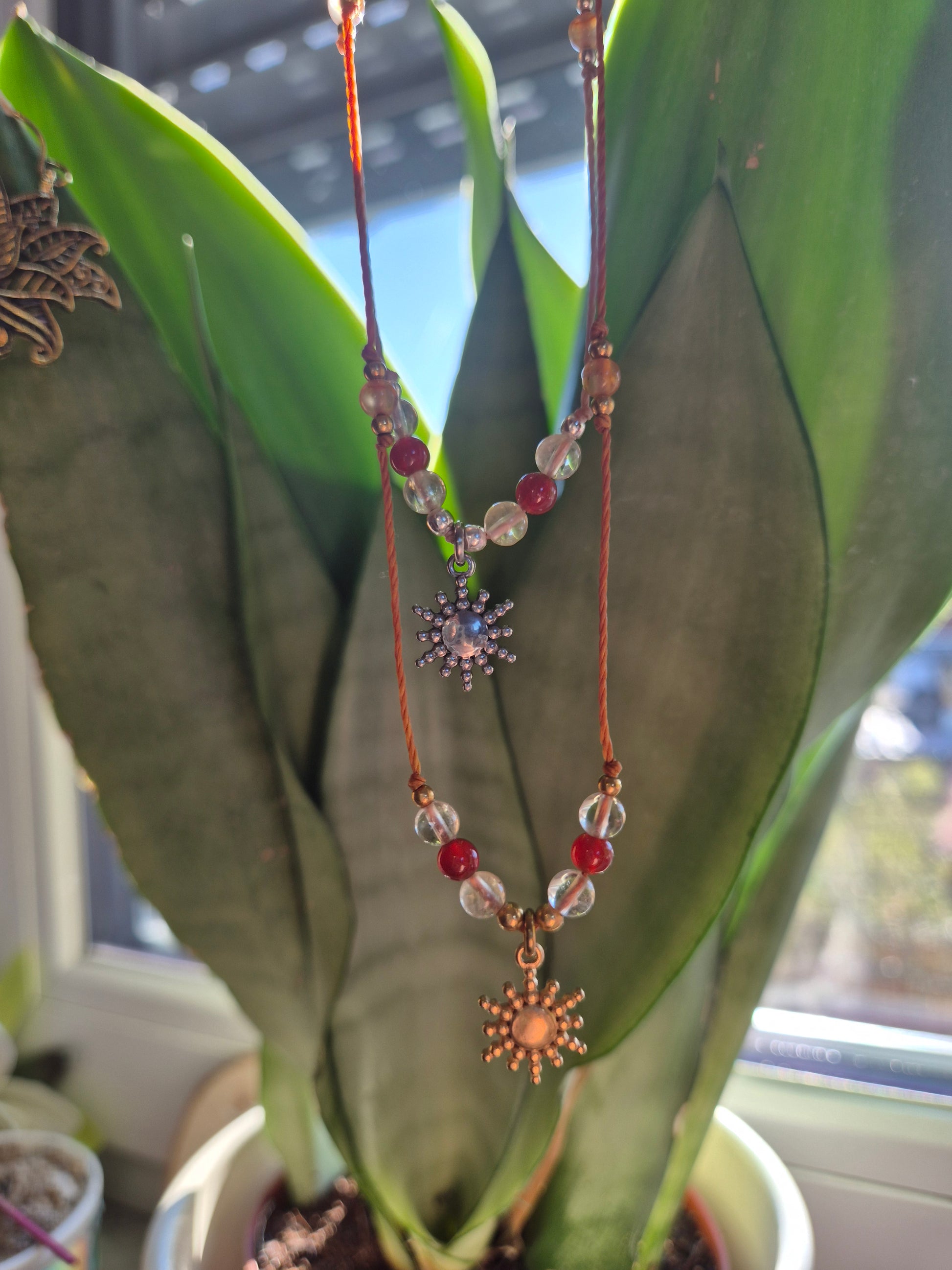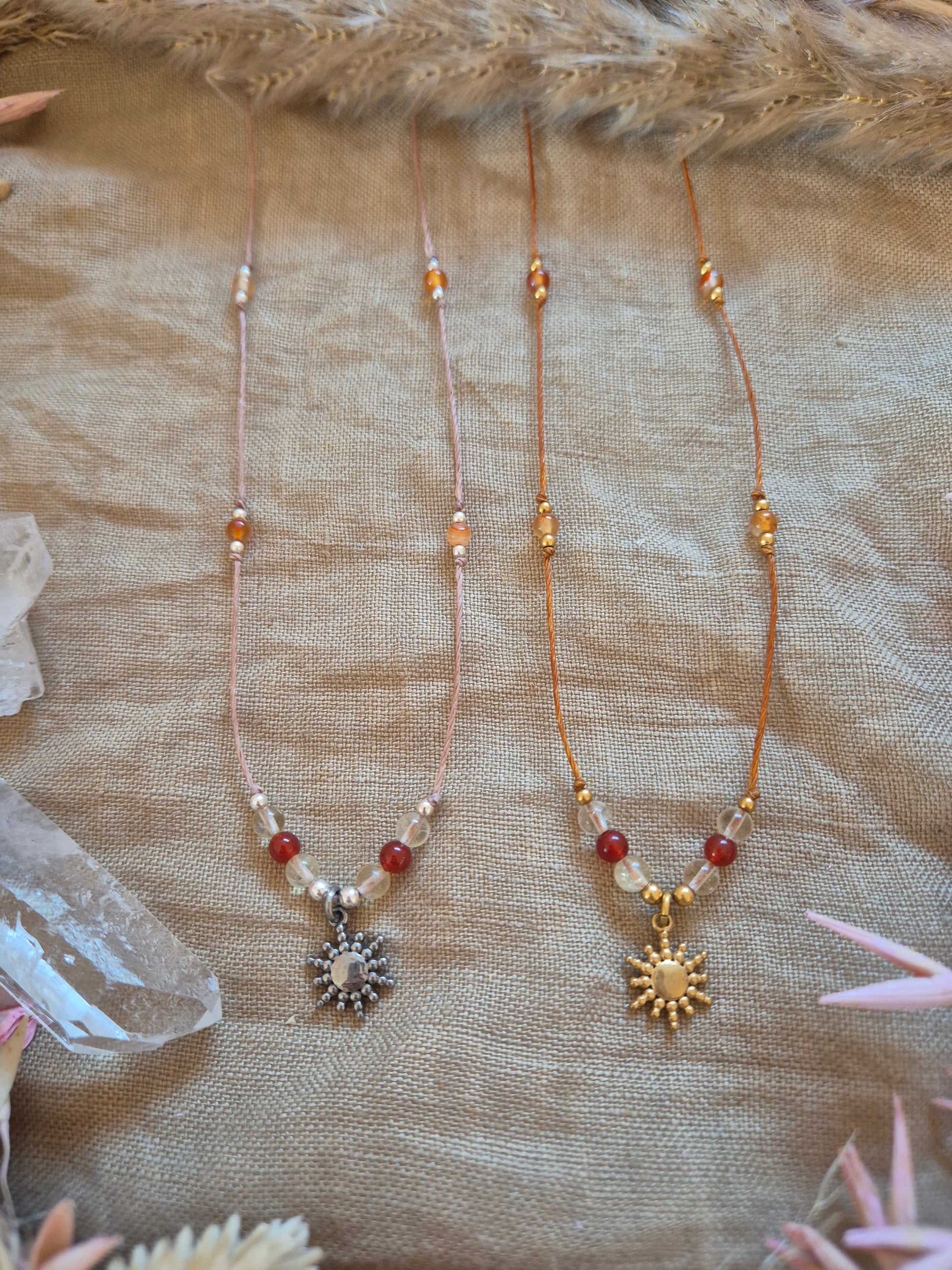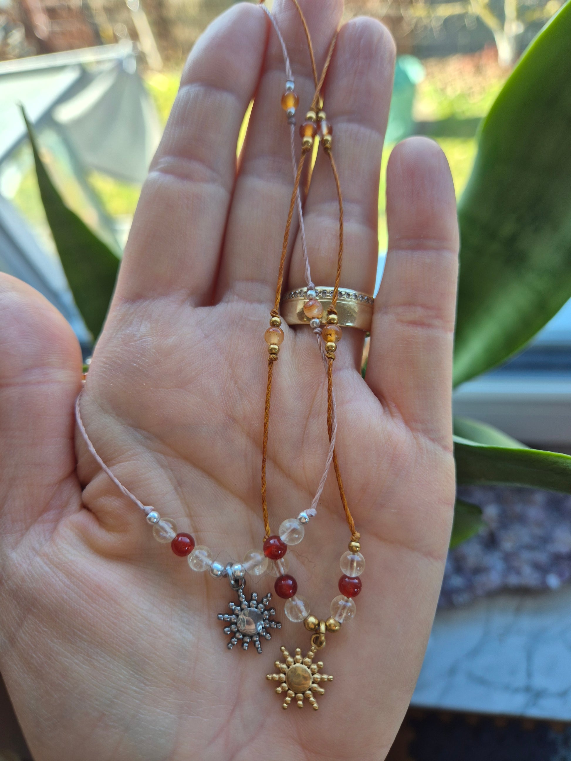 Zum Sonnen-Anhänger und strahlenden Citrin gesellt sich hier der feurige Karneol – für Mut, Kreativität und pure Lebensenergie.
