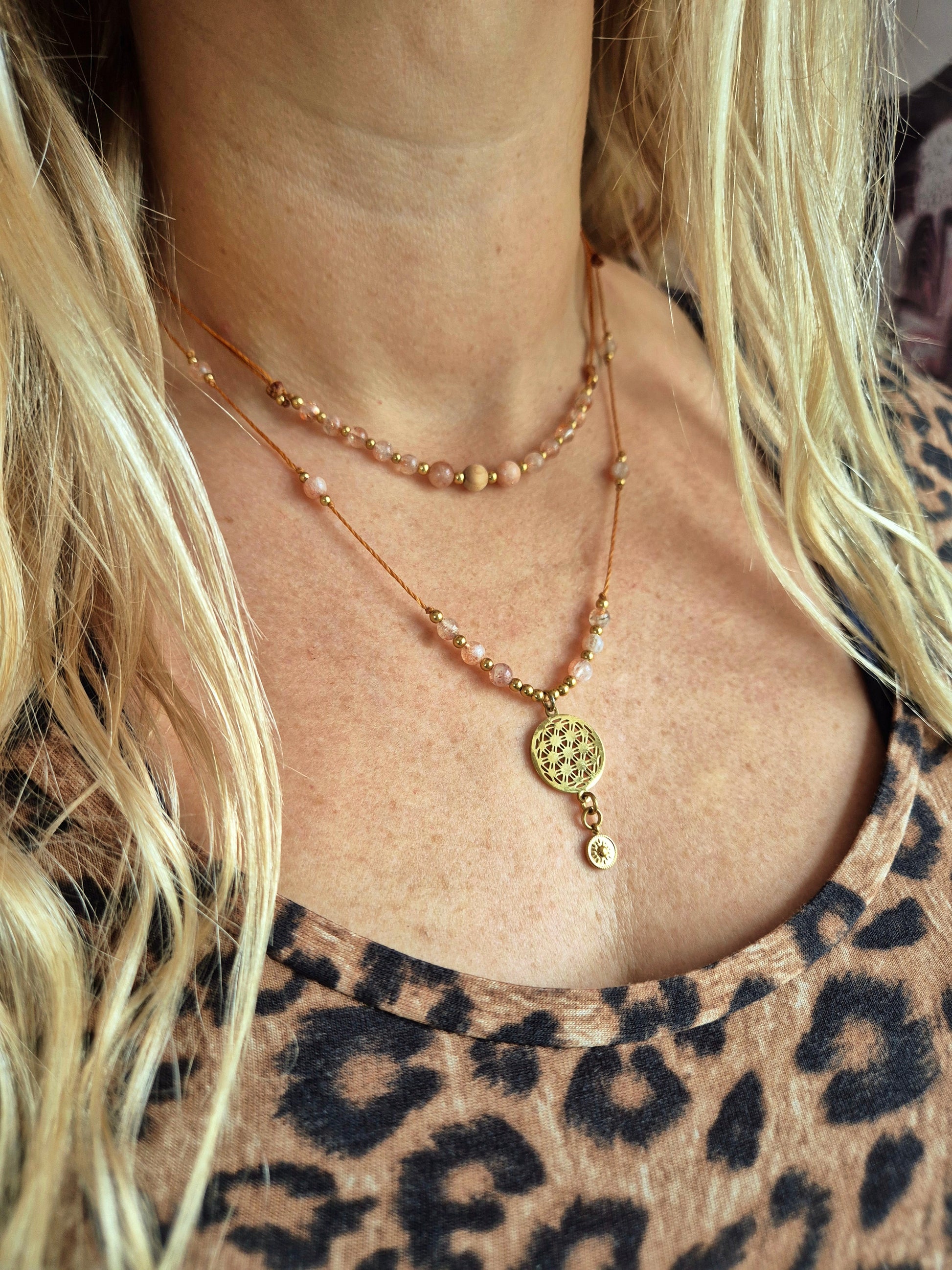 Dazu passt perfekt die zarte, längere Kette mit Sonnenstein, Lebensblume und einer kleinen Sonne – ein Symbol für Lebenskraft, Freude und goldene Momente.