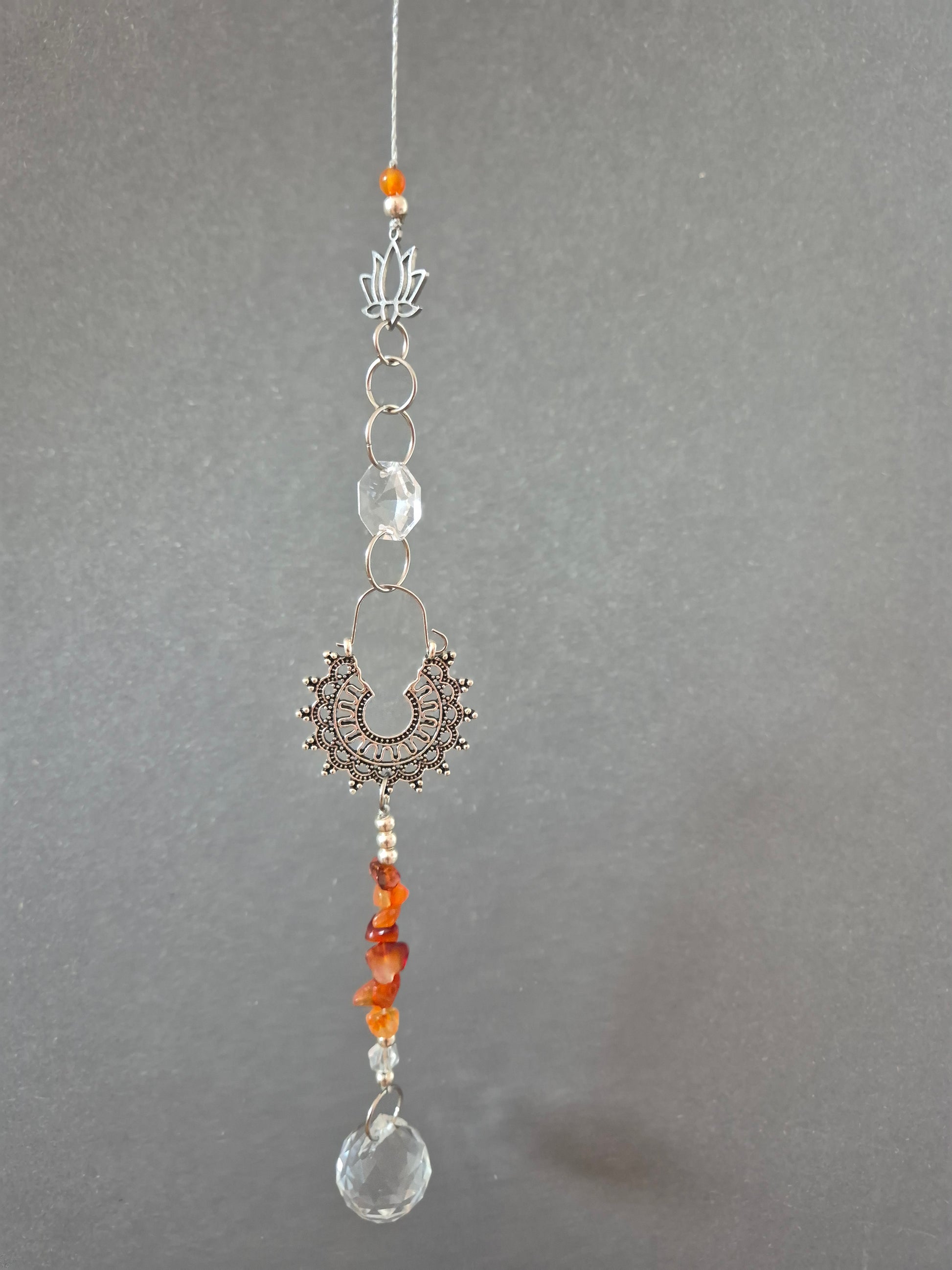 Ein kleines Stückchen Magie für dein Zuhause: Dieser Sonnenfänger mit dem Symbol des Lotus und einem strahlenden Karneol bringt Wärme, Licht und Lebenskraft in dein Leben.